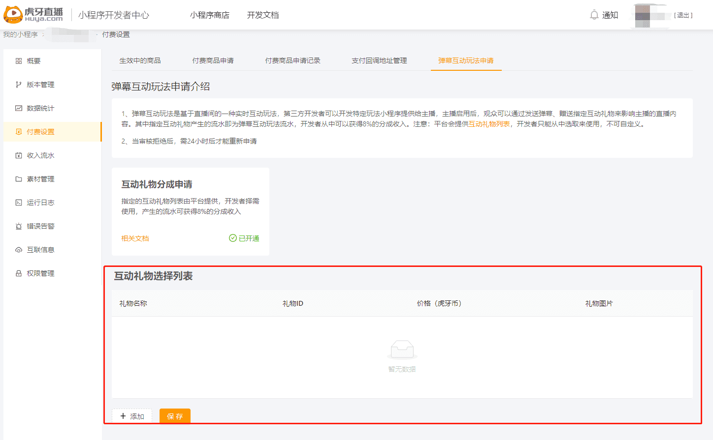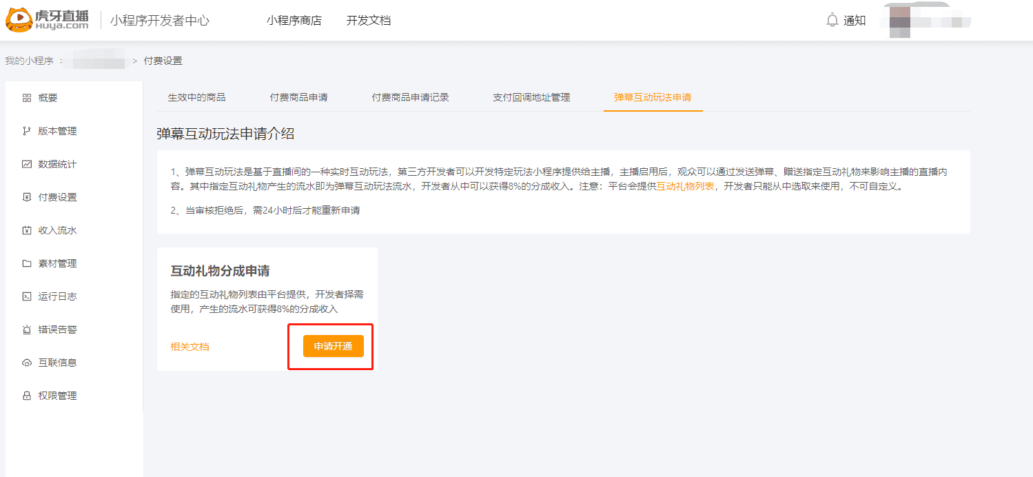 在开发者中心,小程序管理中,点击左侧菜单的“付费设置”,点击“弹幕互动玩法申请”栏目